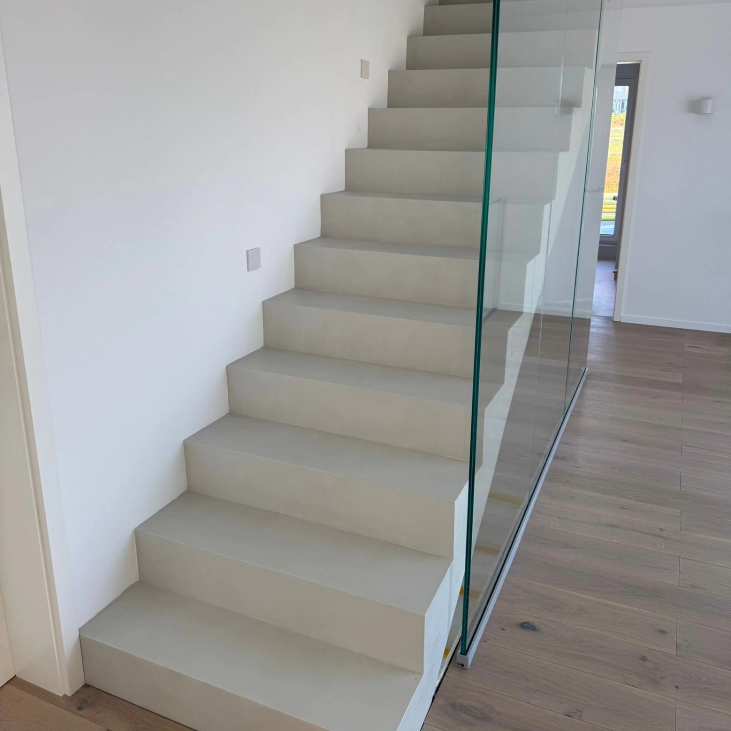 De trappen van de villa – een elegante combinatie van basalto en eikenhout, perfect voor een eigentijds design.
