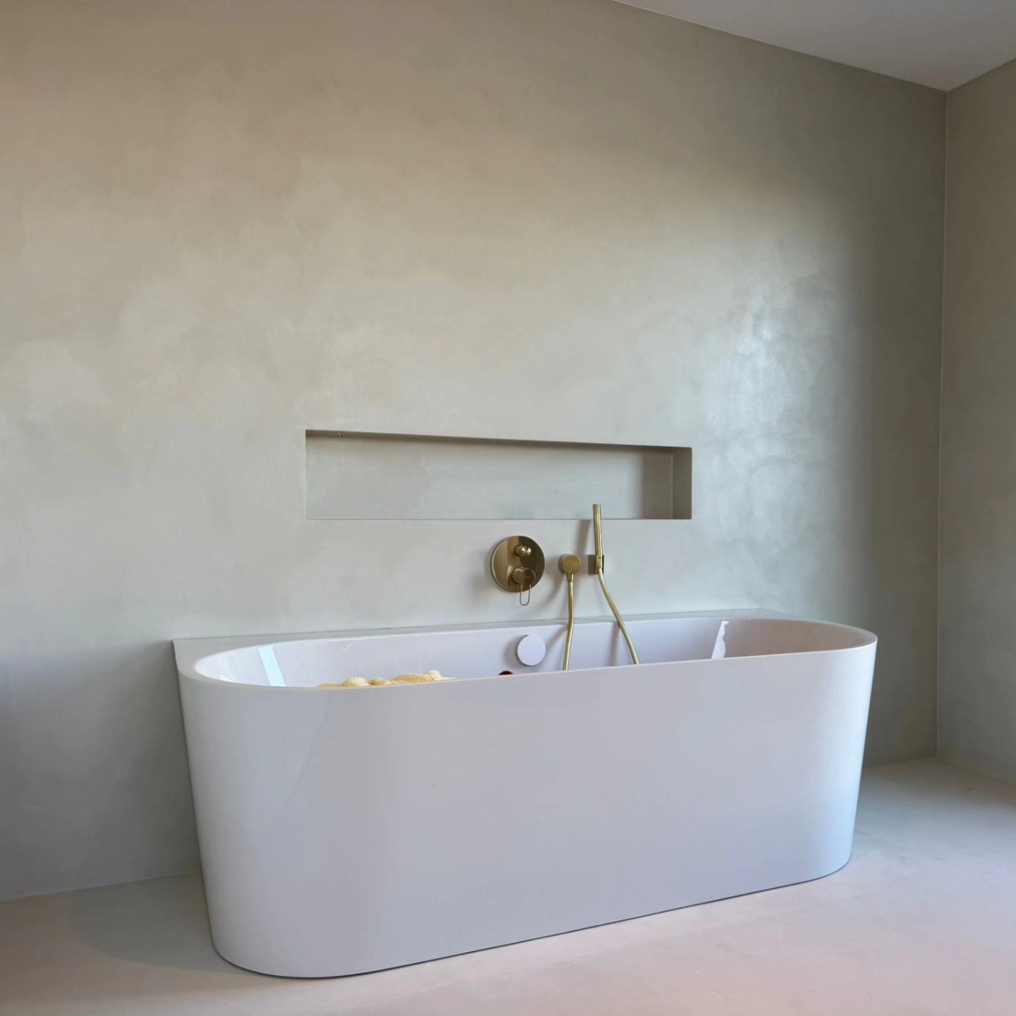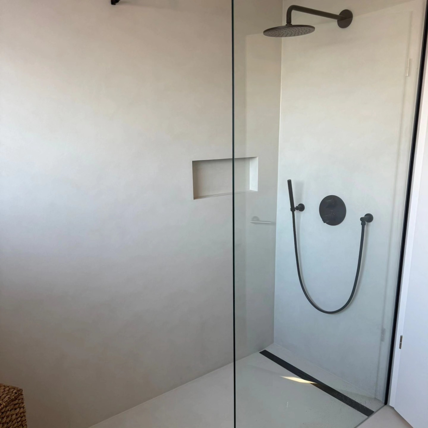 Muren van de douche en de badkamer met bad – een verfijnde textuur die zorgt voor een luxe en ontspannende sfeer.